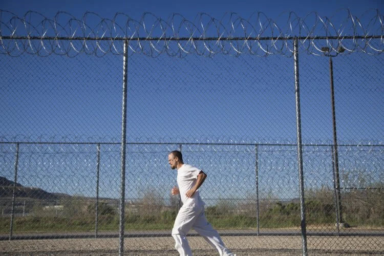 Donald Duncan, of Carbon County, runs along the razor wire fence during the Addict II Athlete run at the Utah State Prison's Promontory facility in Draper on Tuesday, April 28, 2015. The 5K is targeted to providing a health and stress outlet.