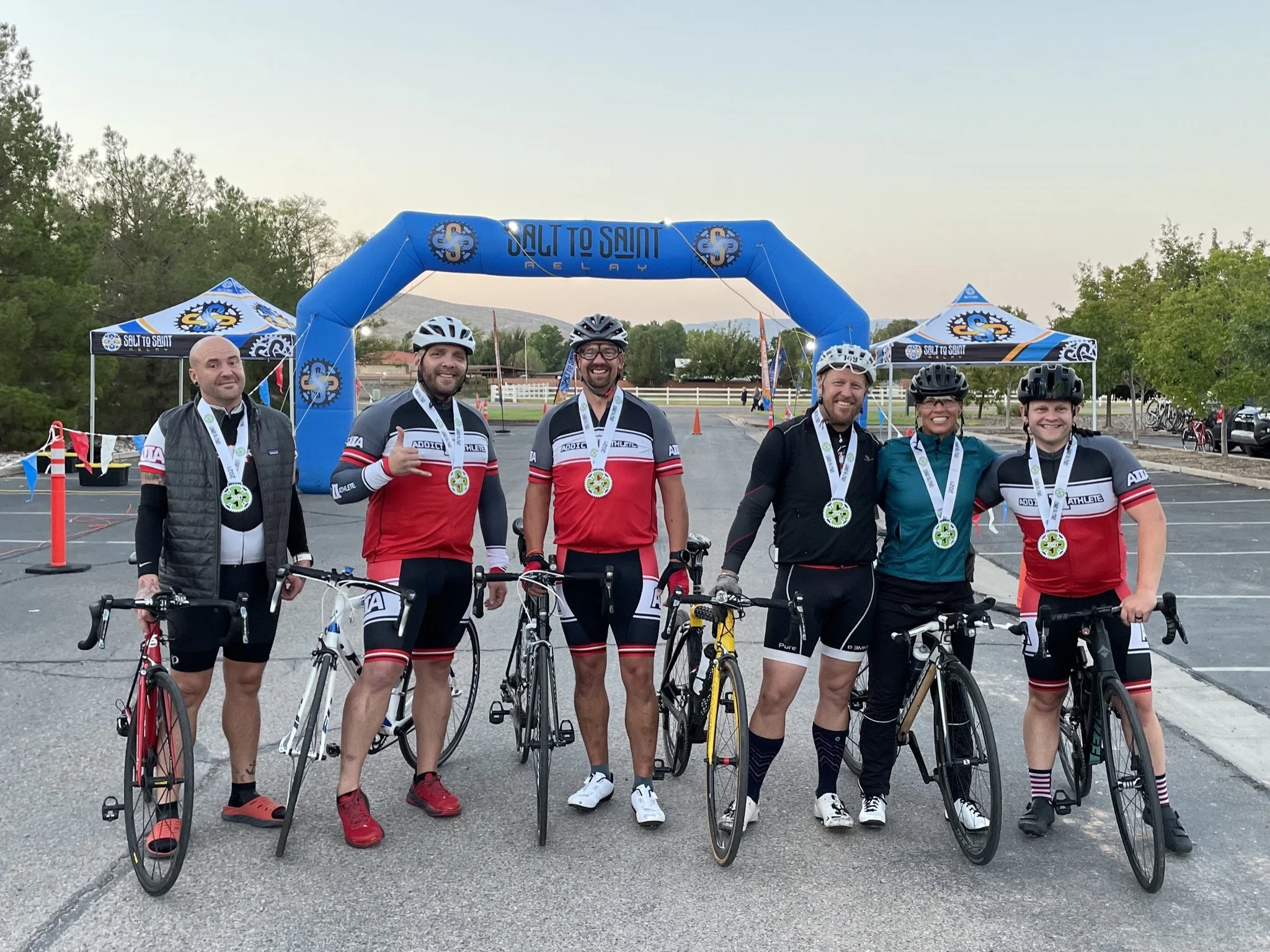 A group of individuals in addiction recovery pose for a photo while representing Addict II Athlete at a community race, St. George, Utah, date not specified.